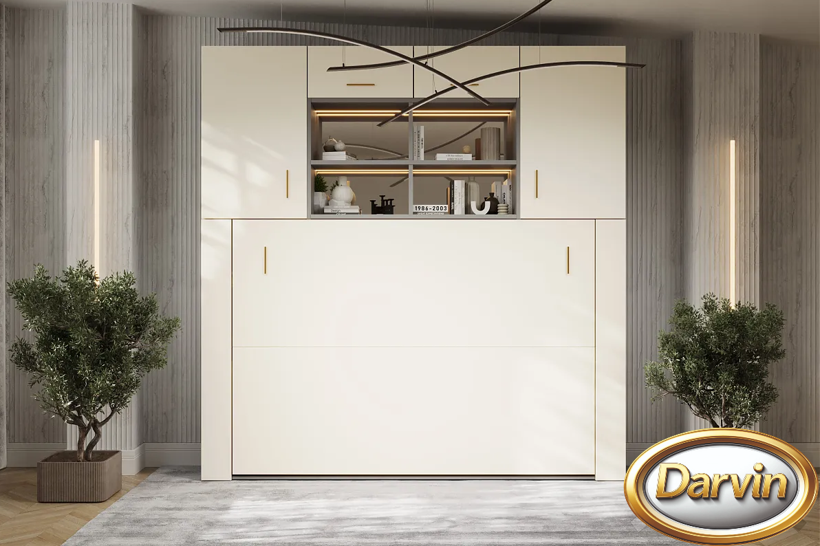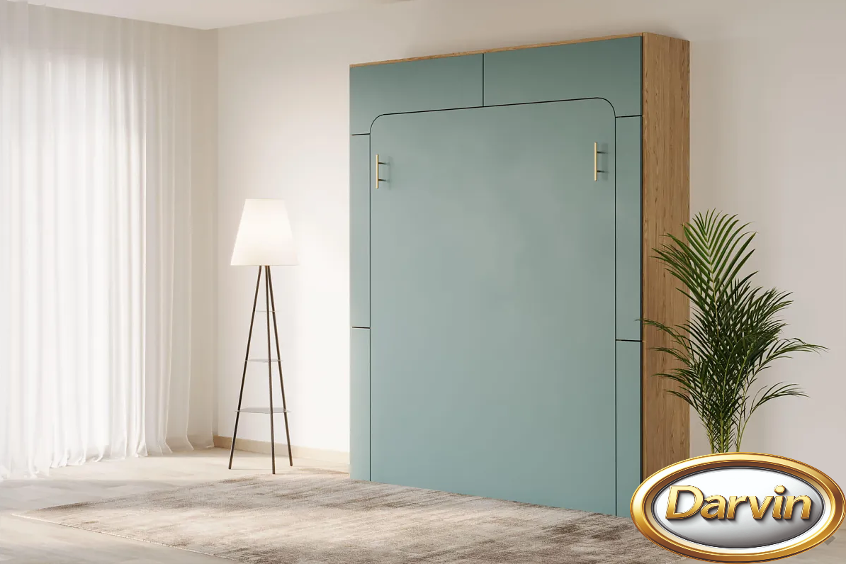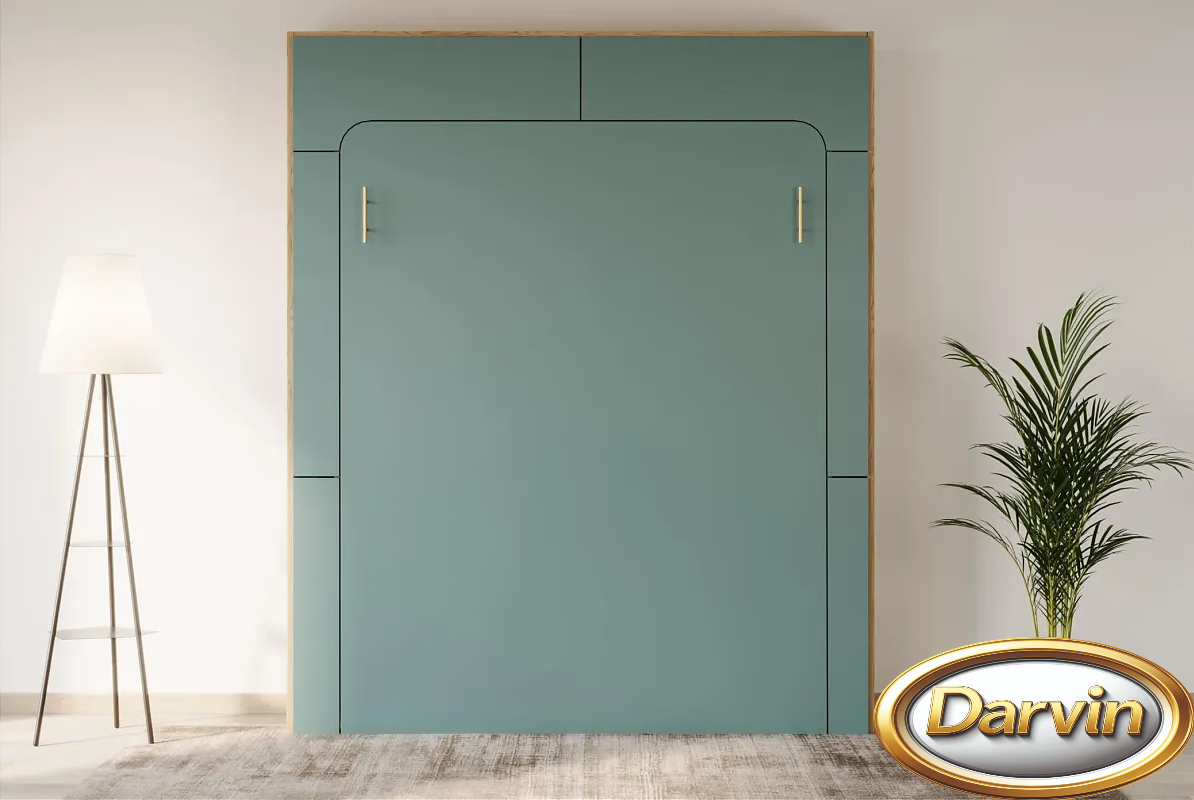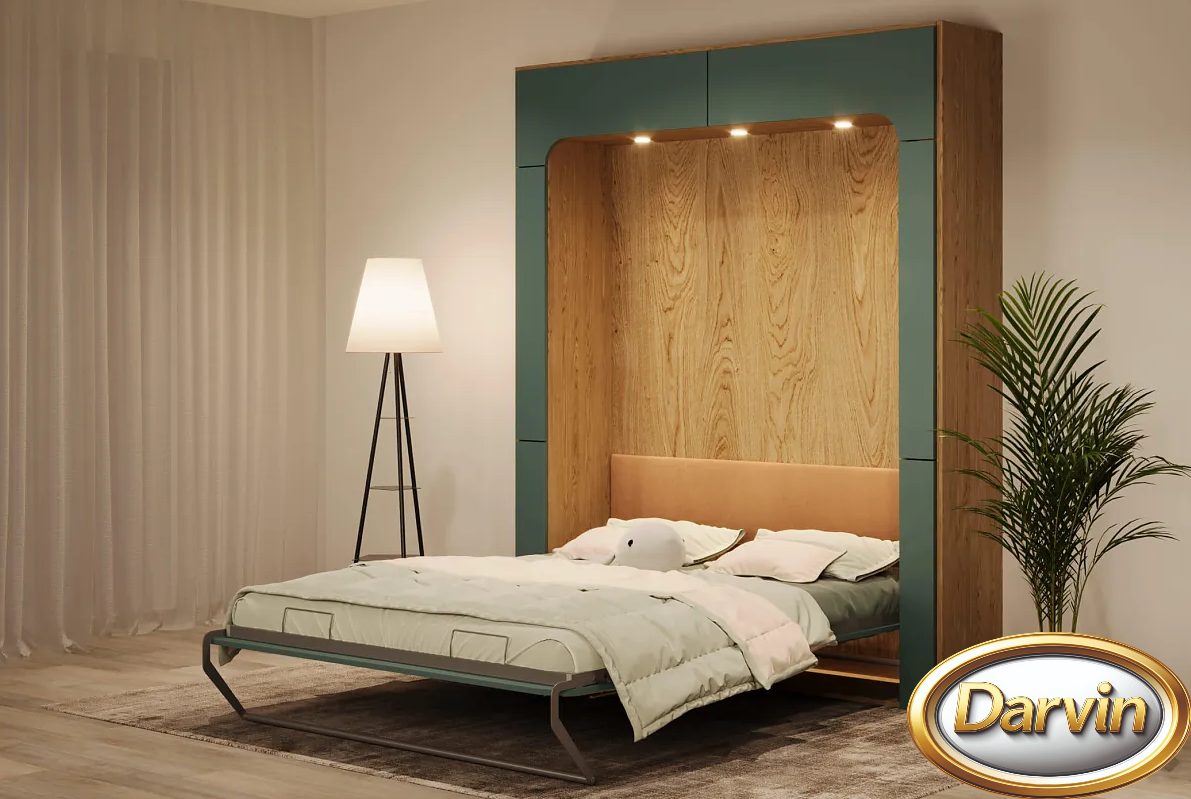 Шкаф-кровать с вертикальным расположением матраса. Модель оснащена диваном и доп-местом. Доп-место изготавливается шириной от 400 до 800 мм. Доп-место оснащено подъемным механизмом, а внутри находится бельевой ящик. С одного бока кровати расположены узкие открывающиеся фасады, за которыми расположены две нижние полки с доступом как изнутри кровати, так и снаружи, и две верхние полки с доступом снаружи. С другого бока располагается тумба с бельевым ящиком и тремя полками над ней. Эта модель может быть выполнена с антресолью. Внутри кровати могут быть установлены розетки, зарядные устройства для телефонов, бра, точечная или ленточная подсветка. Изголовье кровати может быть выполнено в откидном или стационарном варианте. На задней стенке кровати можно установить пано (мягкие панели оббитые тканью) различной конфигурации. На фасаде кровати и на задней стенке кровати можно разместить фотопечать. Матрас кровати можно поместить в мягкий короб. Механизм кровати закрыт специальным чехлом. Фасад кровати с матрасом шириной 800 и 900 мм выполняется цельным листом. Фасад кровати с матрасом большей ширины изготавливается с разделением. Разделение фасада может быть вертикальным и горизонтальным. На фасад кровати можно наклеить зеркало.