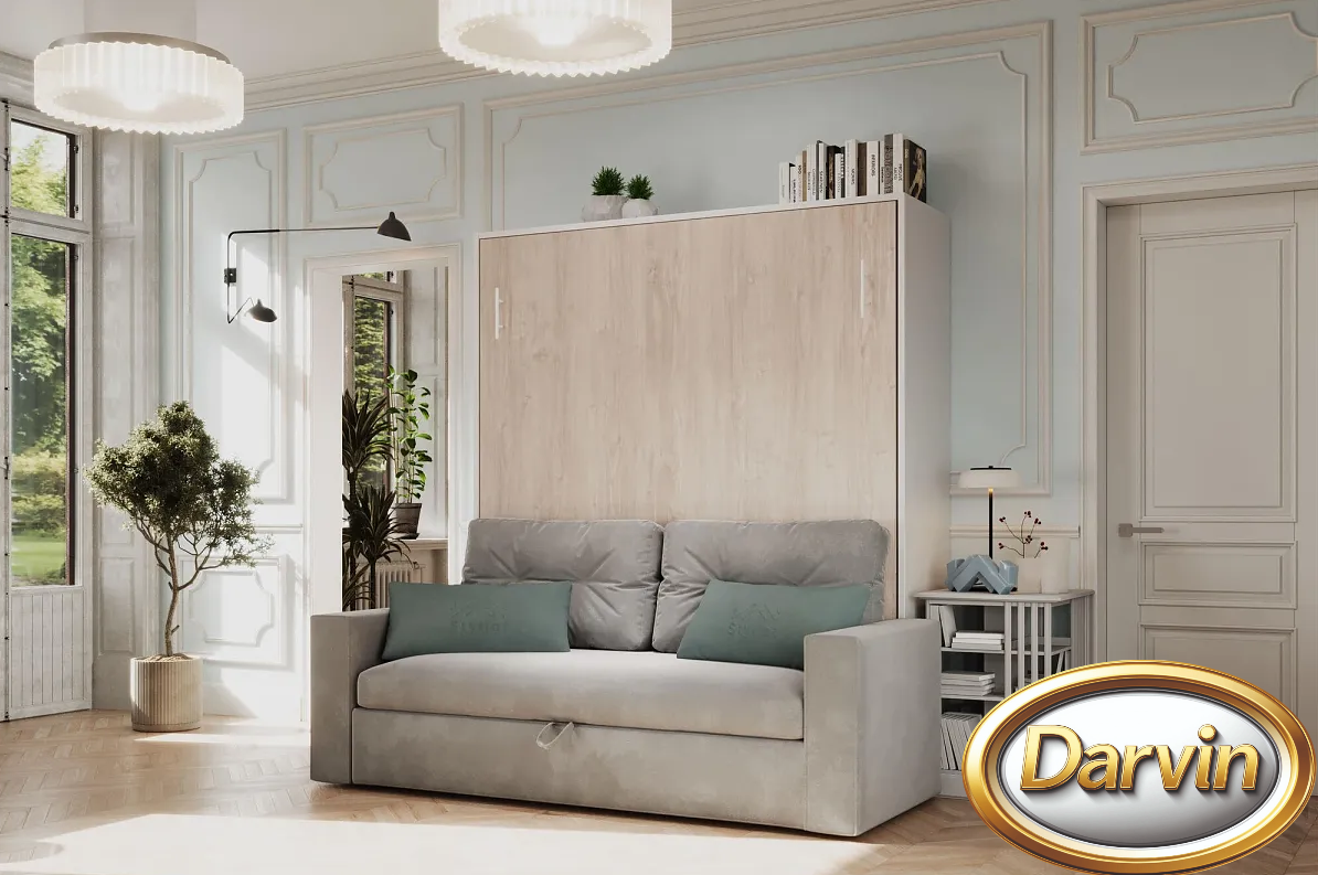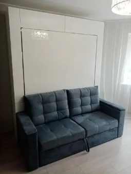 Шкаф-кровать с вертикальным расположением матраса. Модель оснащена диваном. Эта модель может быть выполнена с антресолью. Внутри кровати могут быть установлена точечная или ленточная подсветка. Изголовье кровати может быть выполнено в откидном или стационарном варианте. На задней стенке кровати можно установить пано (мягкие панели оббитые тканью) различной конфигурации. На фасаде кровати и на задней стенке кровати можно разместить фотопечать. Матрас кровати можно поместить в мягкий короб. Механизм кровати закрыт специальным чехлом. Фасад кровати с матрасом шириной 800 и 900 мм выполняется цельным листом. Фасад кровати с матрасом большей ширины изготавливается с разделением. Разделение фасада может быть вертикальным и горизонтальным. На фасад кровати можно наклеить зеркало.