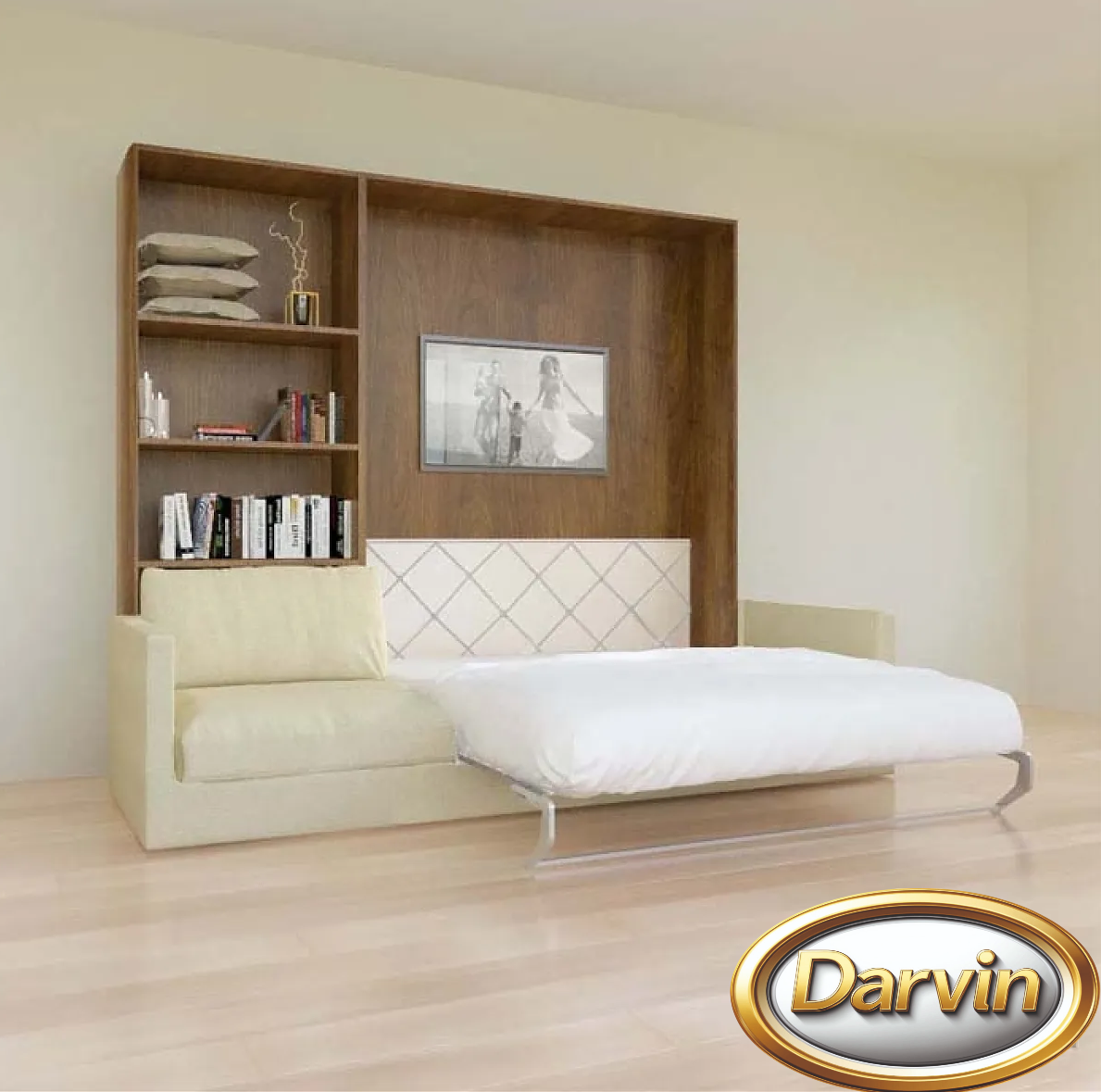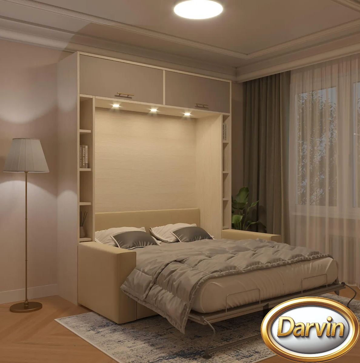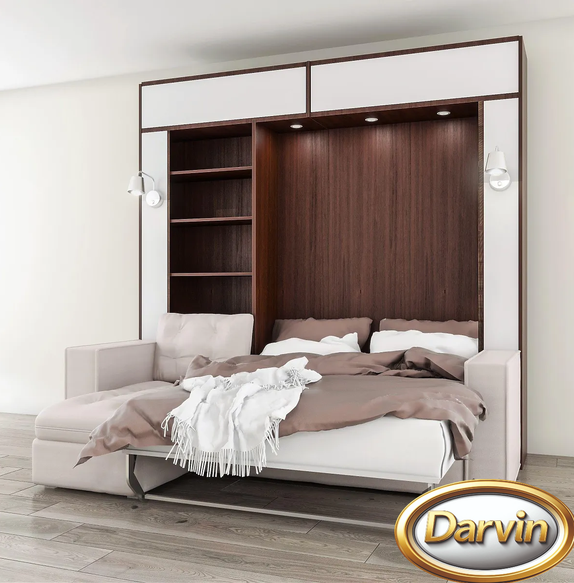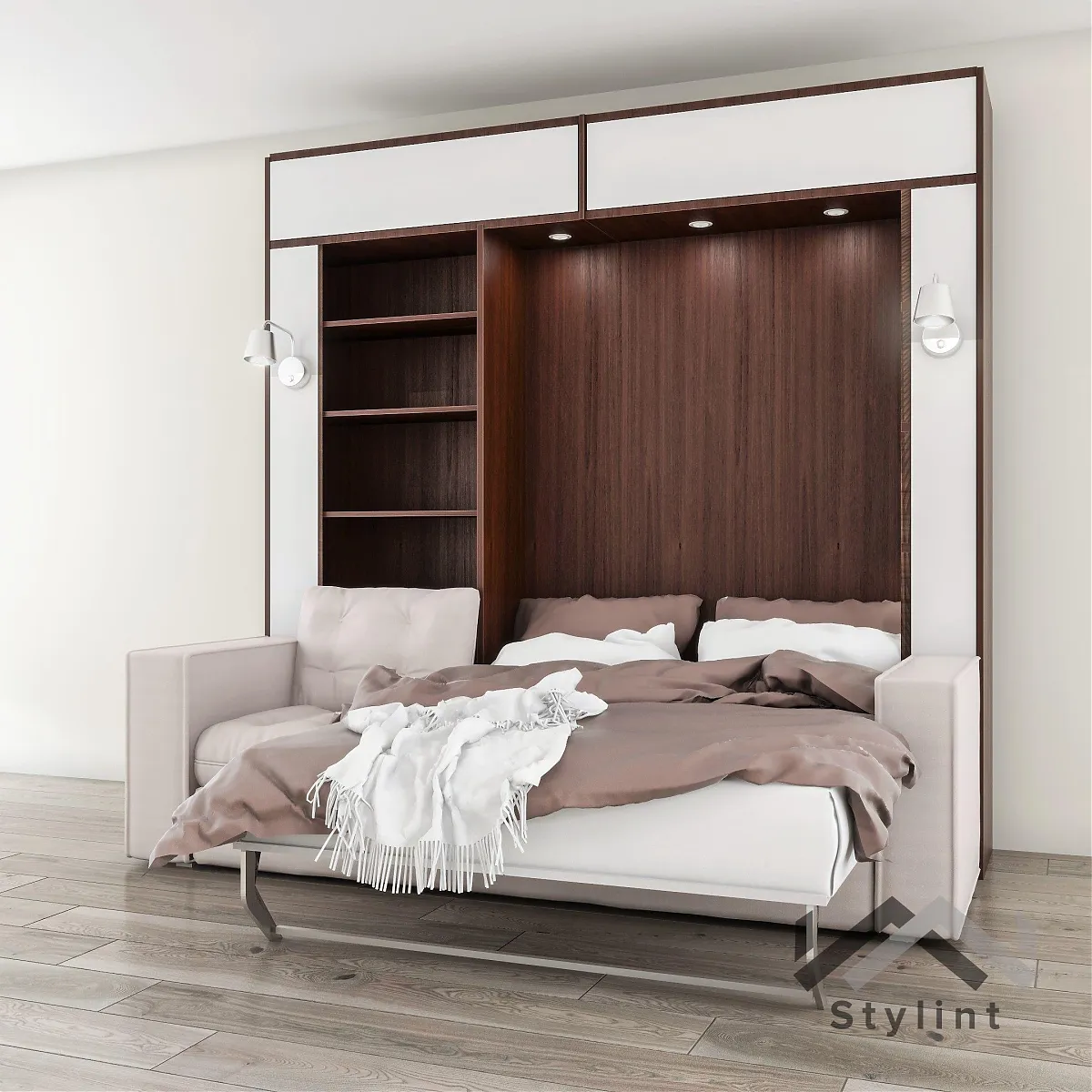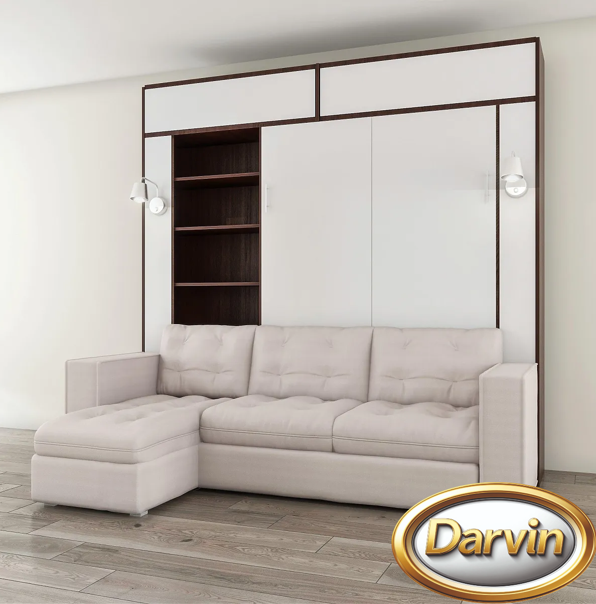 Шкаф-кровать с вертикальным расположением матраса. Модель оснащена диваном. По бокам кровати расположены четыре открытые полки. Эта модель может быть выполнена с антресолью. Внутри кровати могут быть установлена точечная или ленточная подсветка. Изголовье кровати может быть выполнено в откидном или стационарном варианте. На задней стенке кровати можно установить пано (мягкие панели оббитые тканью) различной конфигурации. На фасаде кровати и на задней стенке кровати можно разместить фотопечать. Матрас кровати можно поместить в мягкий короб. Механизм кровати закрыт специальным чехлом. Фасад кровати с матрасом шириной 800 и 900 мм выполняется цельным листом. Фасад кровати с матрасом большей ширины изготавливается с разделением. Разделение фасада может быть вертикальным и горизонтальным. На фасад кровати можно наклеить зеркало.