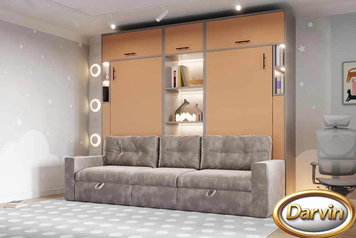 Шкаф-кровать с вертикальным расположением матраса. Модель оснащена диваном и доп-местом. Доп-место изготавливается шириной от 400 до 800 мм. Доп-место оснащено подъемным механизмом, а внутри находится бельевой ящик. За доп-местом располагается тумба с бельевым ящиком и тремя полками над ней. Эта модель может быть выполнена с антресолью. Внутри кровати могут быть установлена точечная или ленточная подсветка. Изголовье кровати может быть выполнено в откидном или стационарном варианте. На задней стенке кровати можно установить пано (мягкие панели оббитые тканью) различной конфигурации. На фасаде кровати и на задней стенке кровати можно разместить фотопечать. Матрас кровати можно поместить в мягкий короб. Механизм кровати закрыт специальным чехлом. Фасад кровати с матрасом шириной 800 и 900 мм выполняется цельным листом. Фасад кровати с матрасом большей ширины изготавливается с разделением. Разделение фасада может быть вертикальным и горизонтальным. На фасад кровати можно наклеить зеркало.